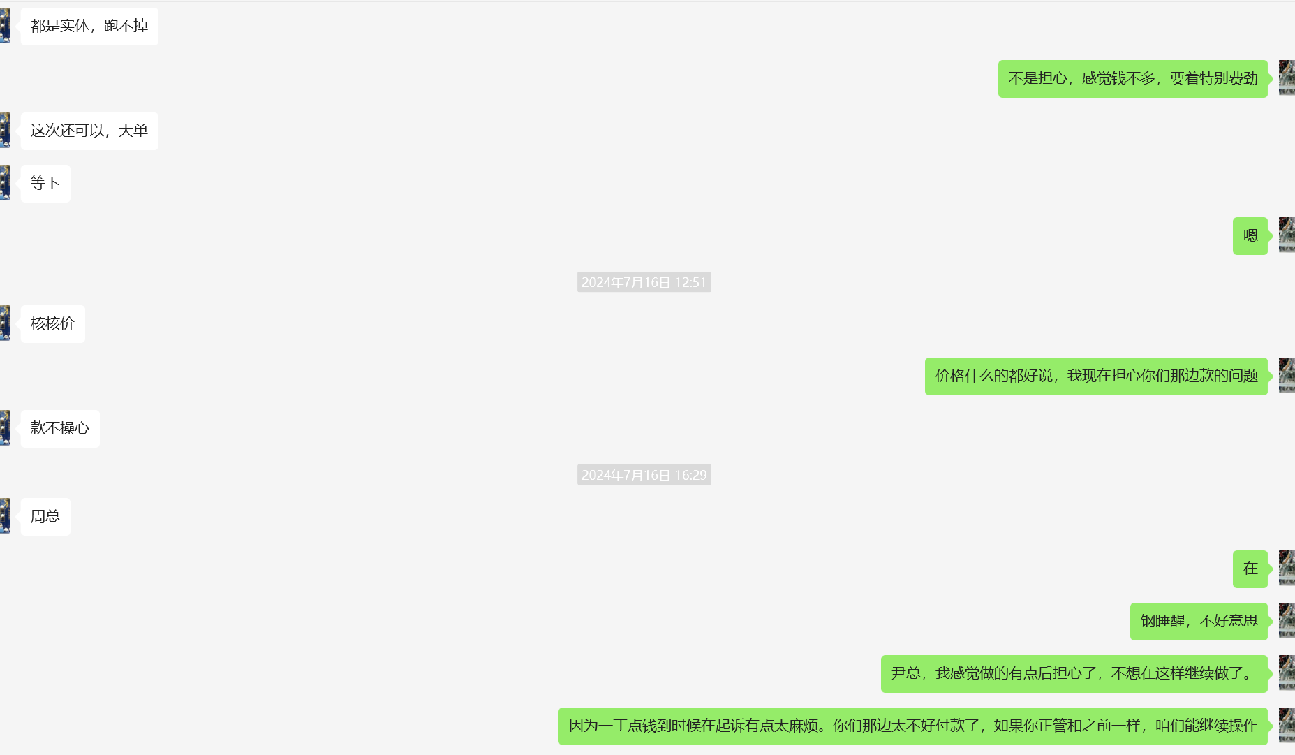 我們是真心實意去做每一份公司的,我們堅持自己的原則, 且我們喜歡和有誠信的公司去合作。此聊天是南京一個工廠,和我們合作3年之久,久而久之信譽度降低,我們果斷采取停止供貨。